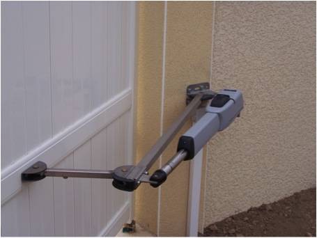Une motorisation de portail battant peut être hydraulique ou électromécanique, à bras articulés ou à bras linéaires, avec ou sans débrayage extérieur, avec ou sans pantographe (système de compensation du déport du vantail à l'intérieur du pilier, représenté ici en association avec un opérateur FAAC 415), chaque caractéristique permettant de répondre à des cas spécifiques d'implantation de portail.